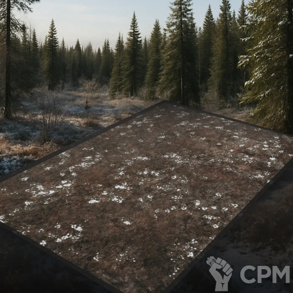 Настольное покрытие для варгеймов, изображающее зимний таёжный лес. Сугробы, замёрзшие кусты и редкие ели создают антураж глухой северной глуши — идеальное поле боя для партизанских атак и выживания в дикой природе.