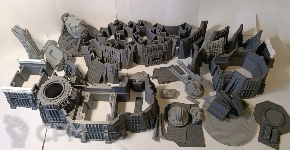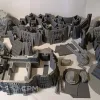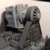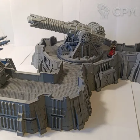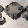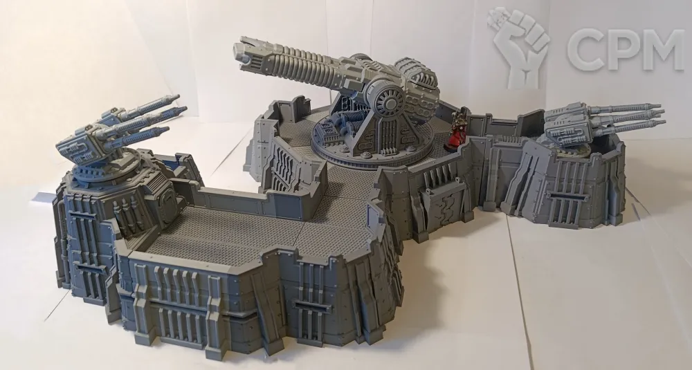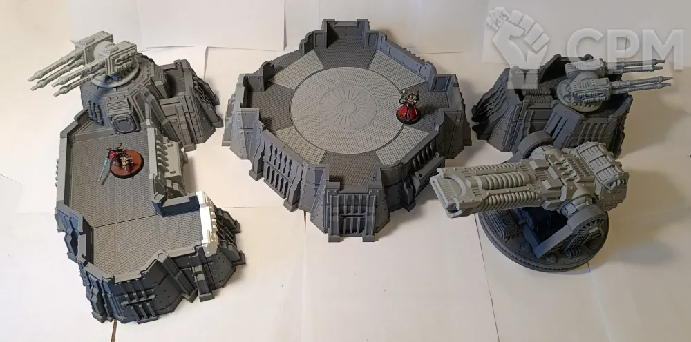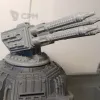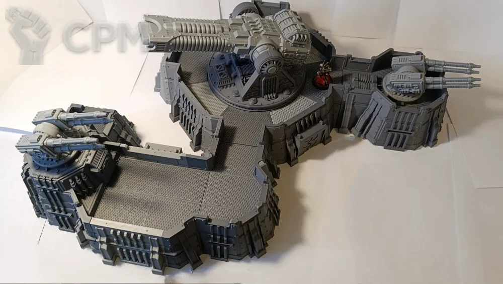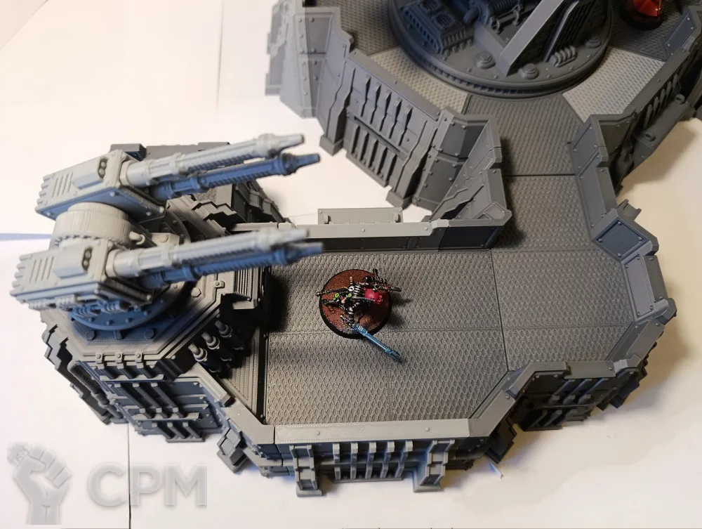 Габариты в сборе 52х42см, высота 20 см (до платформы 7см). Все детали, кроме плазмы и артиллерии, могут быть собраны без клея, на соединители и пазы, для удобства транспортировки и вариативности сборки. Может использоваться как раздельный террейн (3 фото), центральная плазма меняется на плоскую заглушку. Внутренний диаметр центральной площадки 22см, проходы 5,5 и 8,5 см. Длина центральной плазмы 23 см, боковой артиллерии 11 см.