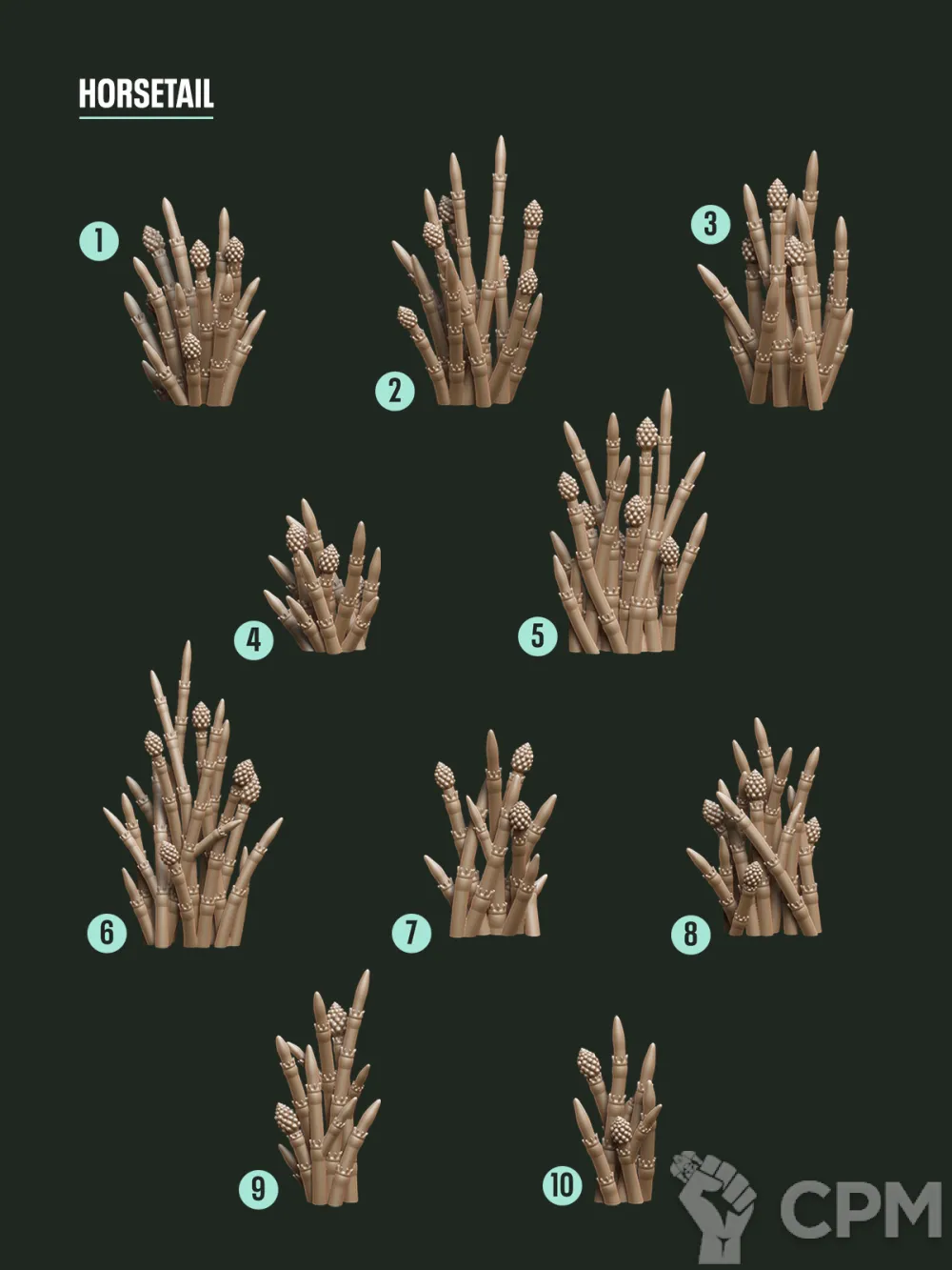 Набор печатных пучков хвоща, состоящий из 10 штук.