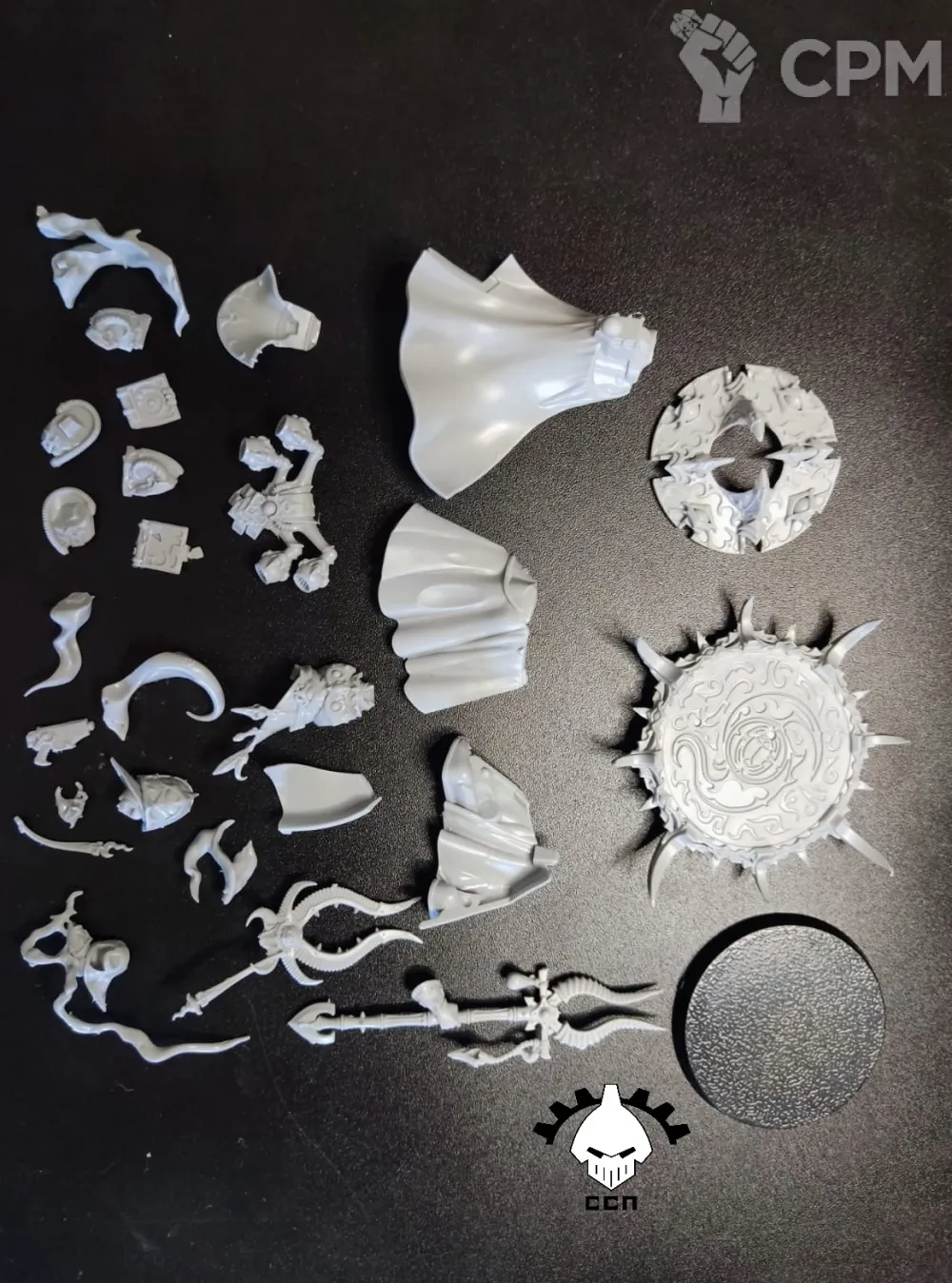 Все доставлено в срок, в комплекте подставочки, упаковано отлично. Сделано литниками, вся детализация полностью на месте, все мельчайшие детальки пролиты, пузырей не обнаружил. В целом все литники получились разные - по цвету, по качеству. Где-то черные разводы в белом пластике (вроде ни на что не влияют), где-то облой в виде волосяной паутинки (убирается очень легко). Один литник был весь в какой-то смазке, даже пакетик с ним промазался изнутри. Пластик странный - серый вроде очень гибкий, хоть пополам складывай, а белый тоже гибкий, но в некоторых местах - хрусь и ломается почти сразу.. С шаманом (с одним литником) не повезло - сам литничек был прям какой-то аркой, и смещения есть - на голове (уже исправил), с руками и хребтинкой придется повозиться. В целом все поправимо, особых проблем не заметил, почти идеал.