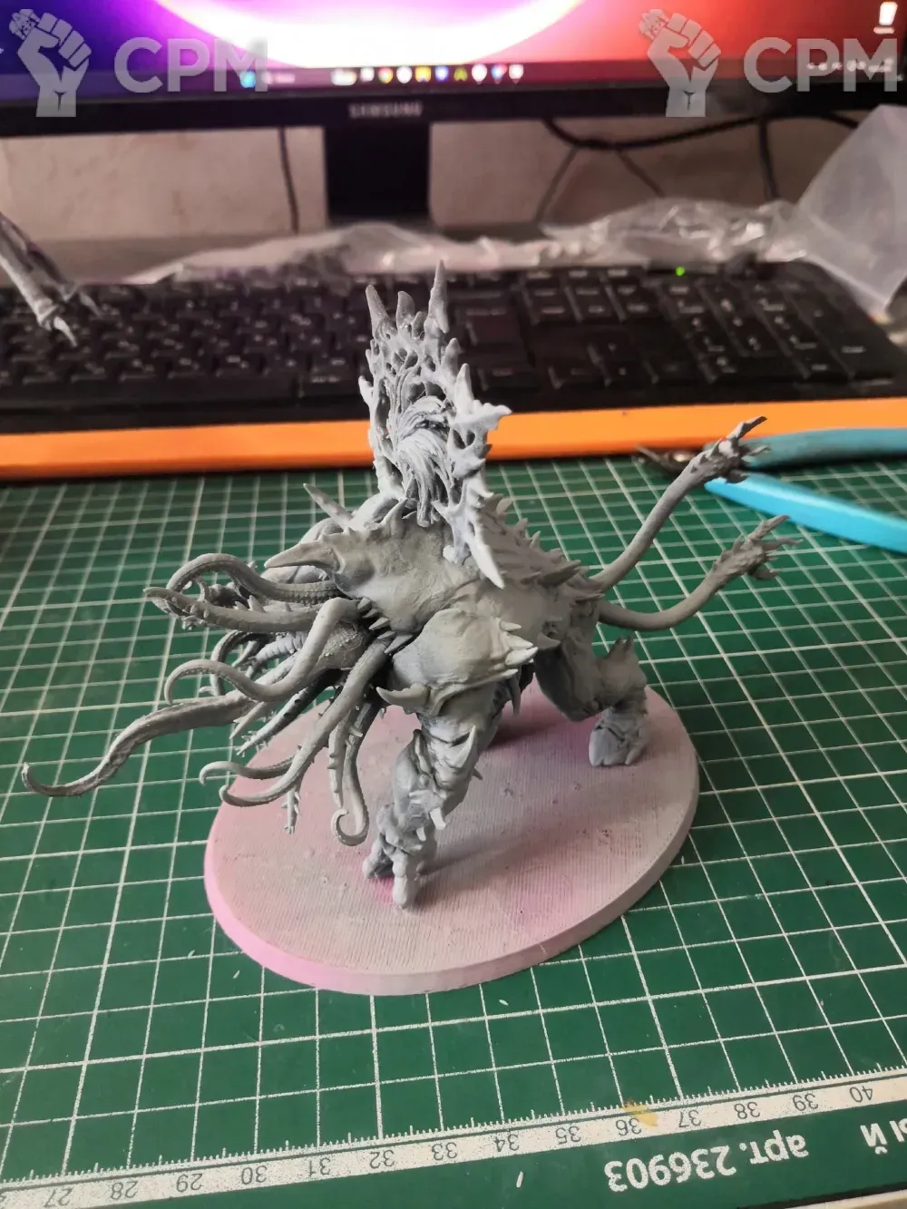 Выиграл в аук орка гримгора. Минька крупная, хорошо детализирована. Печать на уровне. На секире с одной стороны недопечатка лезвия не критична. Нижняя часть её палки не пережила транспортировку, хотя замотана была хорошо, в пупырку и коробочку. Решаемо супер клеем. За свои деньги отличный вариант. Спасибо продавцу