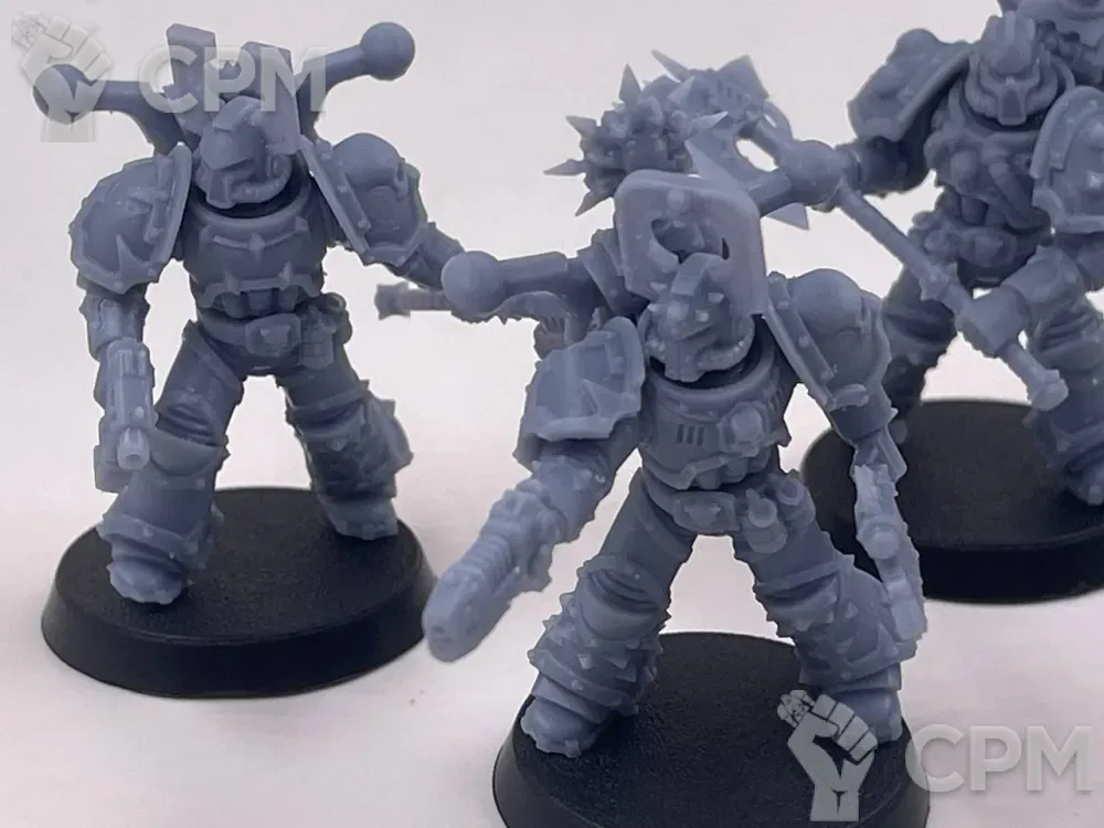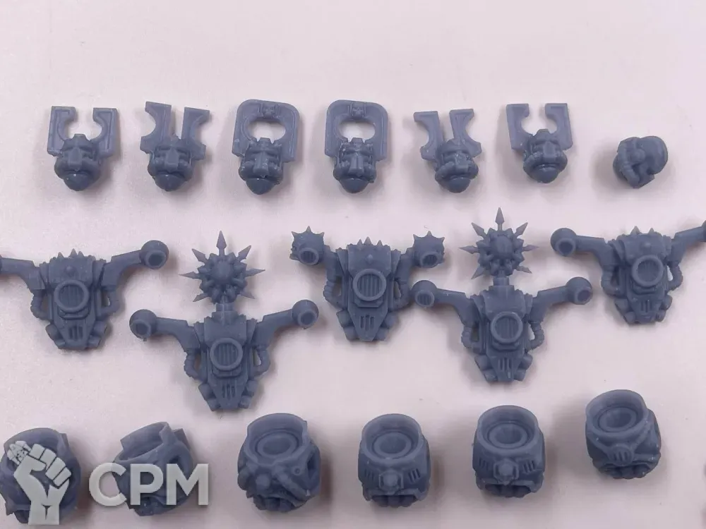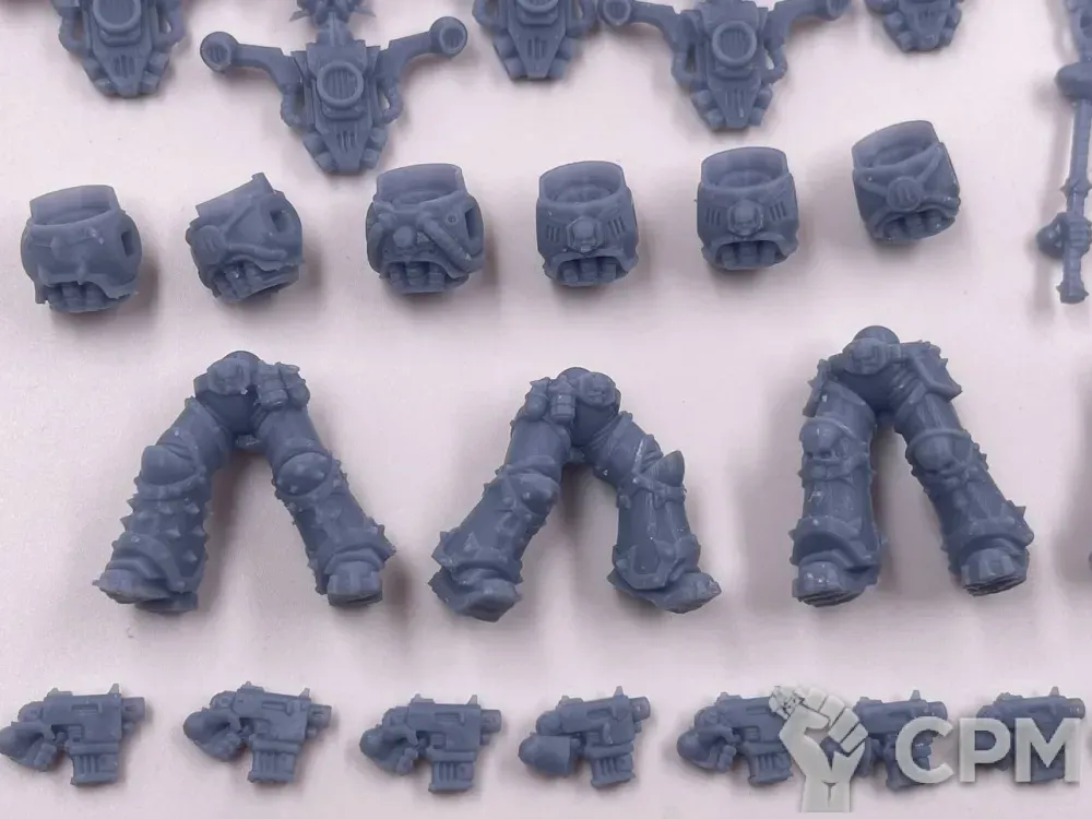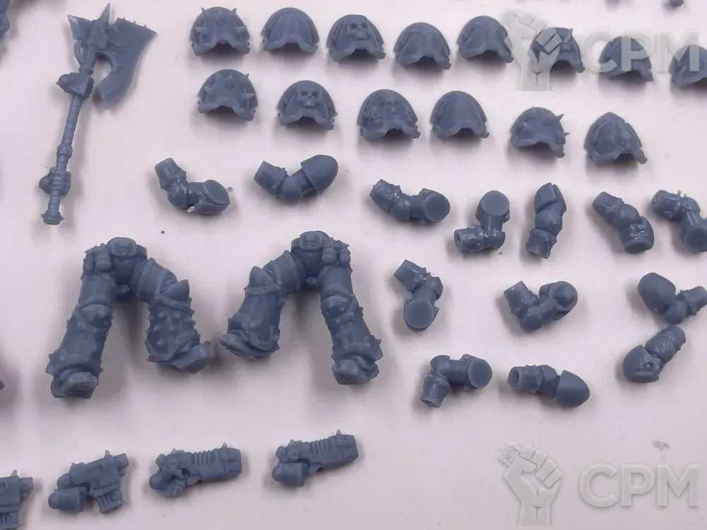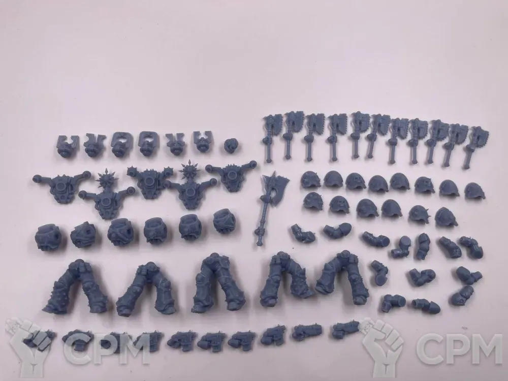 Литье варьируется от отличного до плохого. Толстые каналы для заливки на самых видных местах хелбластеров - сверху ворота, внешней стороны наплечника, удалить бесследно не получится. Есть заметные пузыри, непроливы, две марские тушки будто поплавило. Ощущение, будто к удачной партии примешали брак. Баз в комплекте нет, отправил быстро, упаковка хорошая.