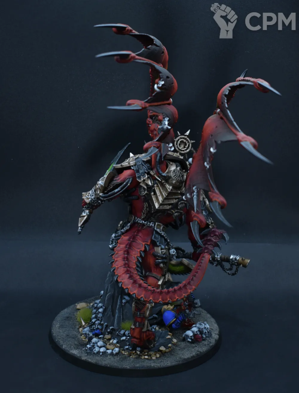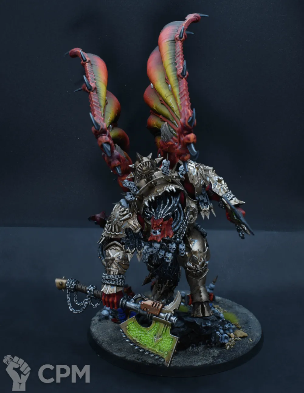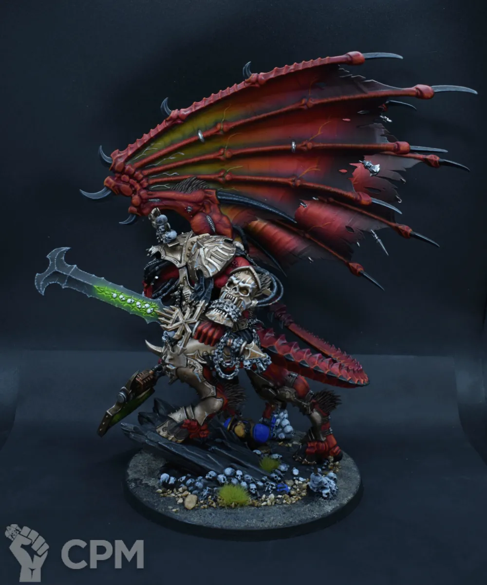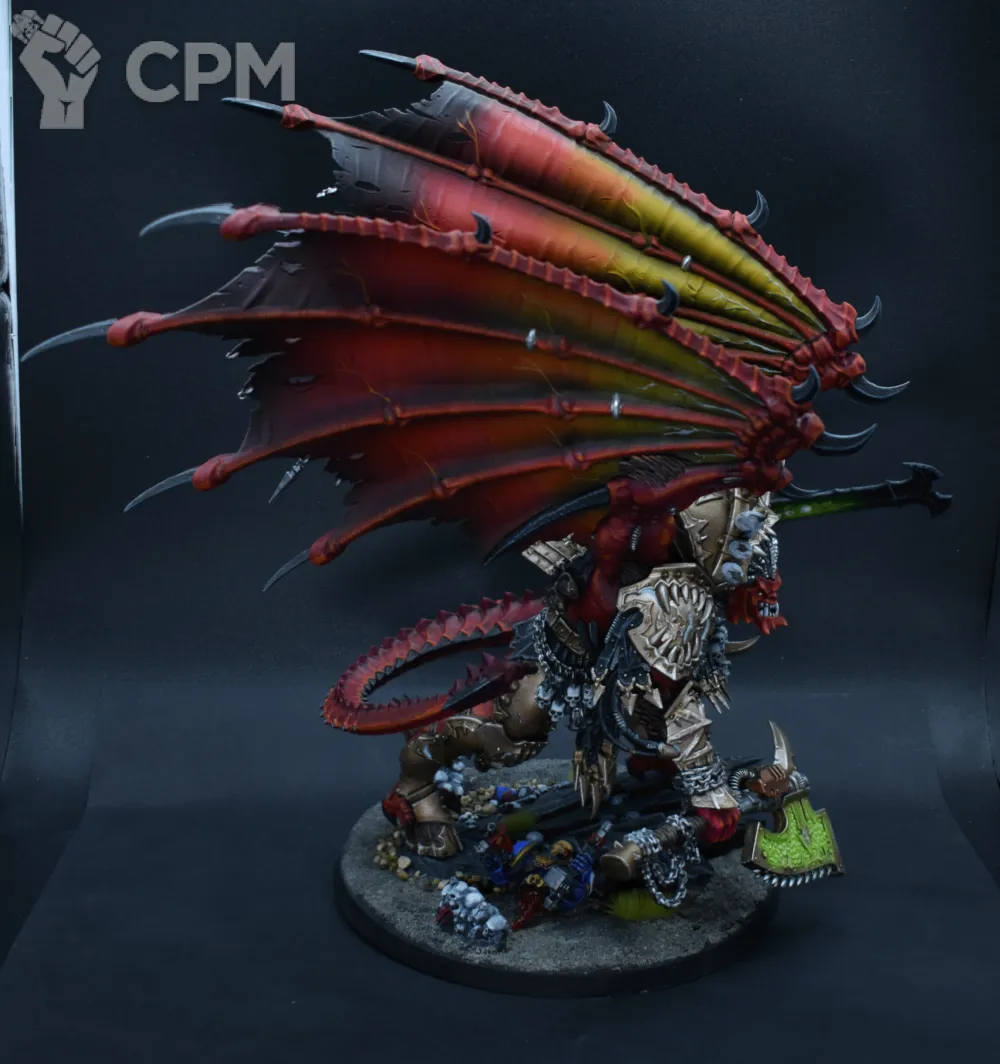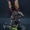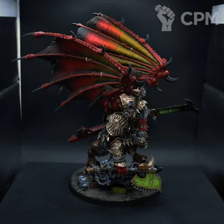 Конверсия интересная сама по себе, оформление подставки тоже очень хорошее, что редкость — не все оформляют их. Покрас, на самом деле, довольно впечатляющий — уверенный такой игровой. Отдельно хочется похвалить за лицо, то есть руну Кхорна, которую лично я б умаялся прокрашивать. Хорошие контуры, хороший шлем на пике, хороший плащ. Единственное, что по моему субъективному мнению, жёлтые трубки на ранце как будто жирноваты и несколько выбиваются из общей картины, но это мелочь. В общем — класс, мне понравилось искренне.