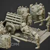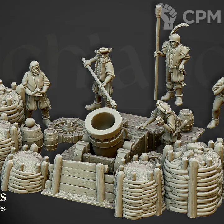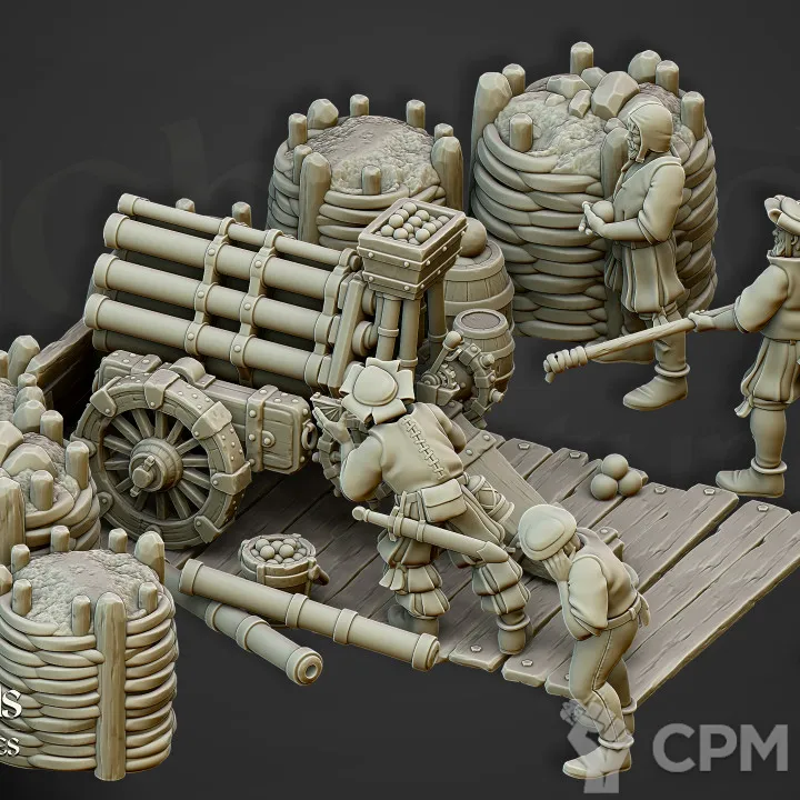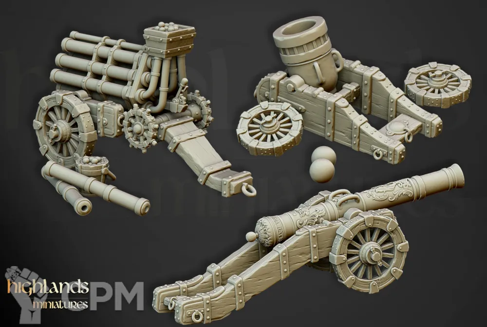 Миниатюры напечатаны на 12k 3д принтере с толщиной слоя в 0.02 мм смолой elegoo. В комплекте детали для сборки одного из орудий. Комплект как представлено на фото, возможна печать дополнительных миниатюр или битсов.