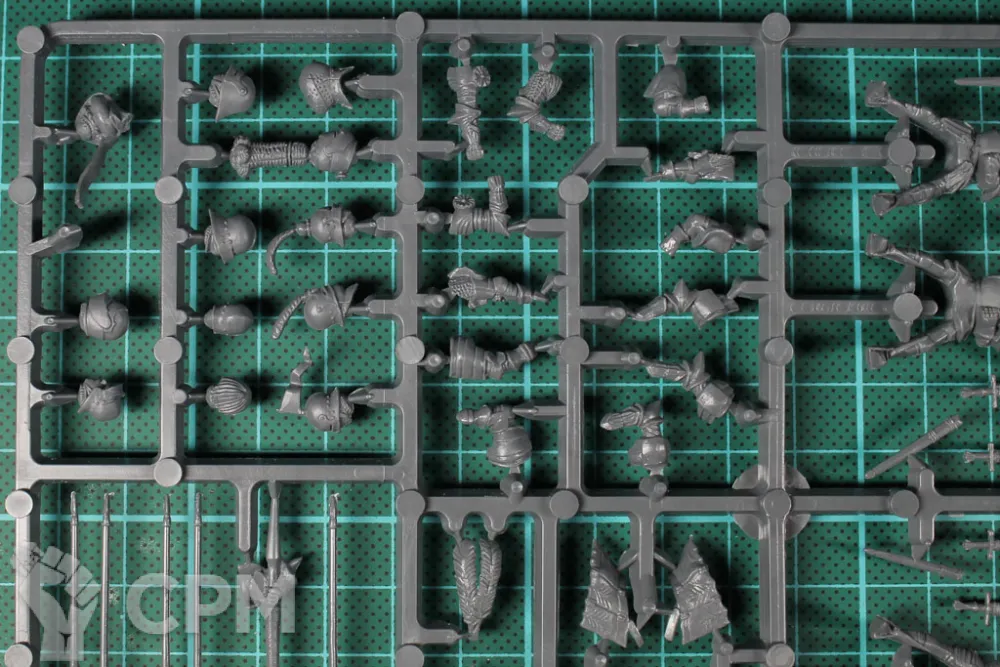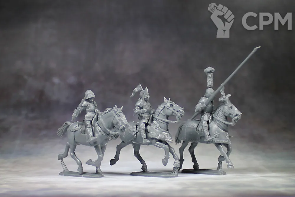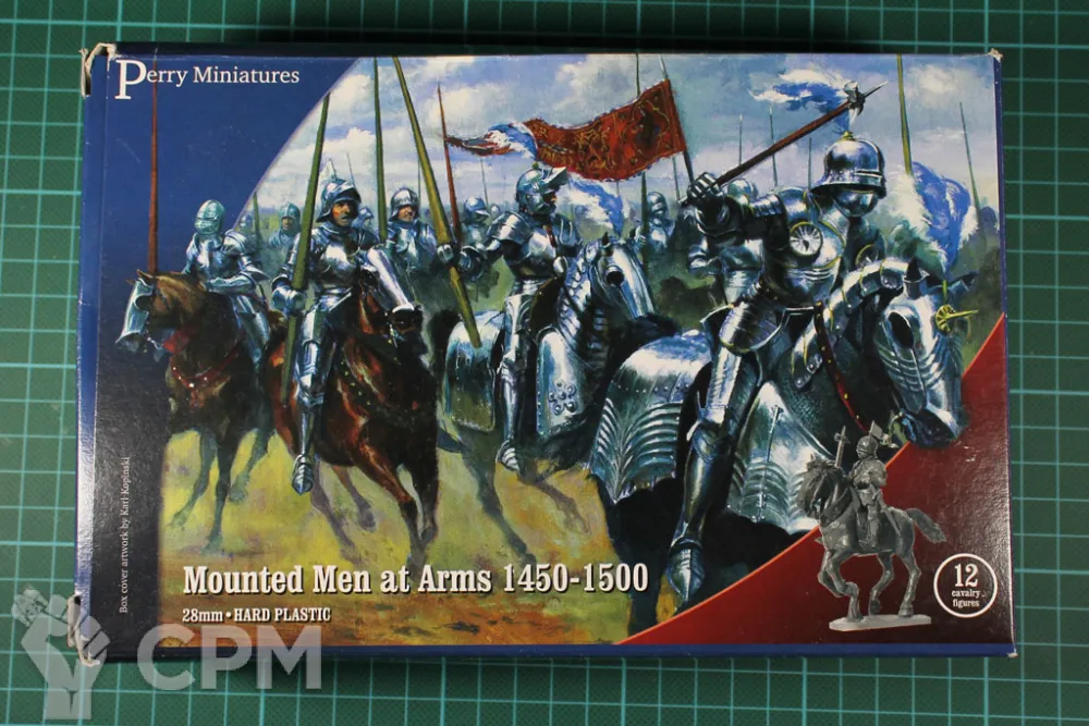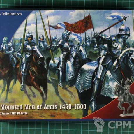Эта коробка содержит 12 всадников, которых можно использовать в большинстве европейских армий. При необходимости есть отдельные доспехи для верховых животных и 7 различных голов лошадей (всего 25). У Men at Arms есть 14 вариантов правой руки и 12 вариантов головы (на 4 всадников). Есть также копье, меч, булава, боевой молот, топор и стандартный шест / копье.