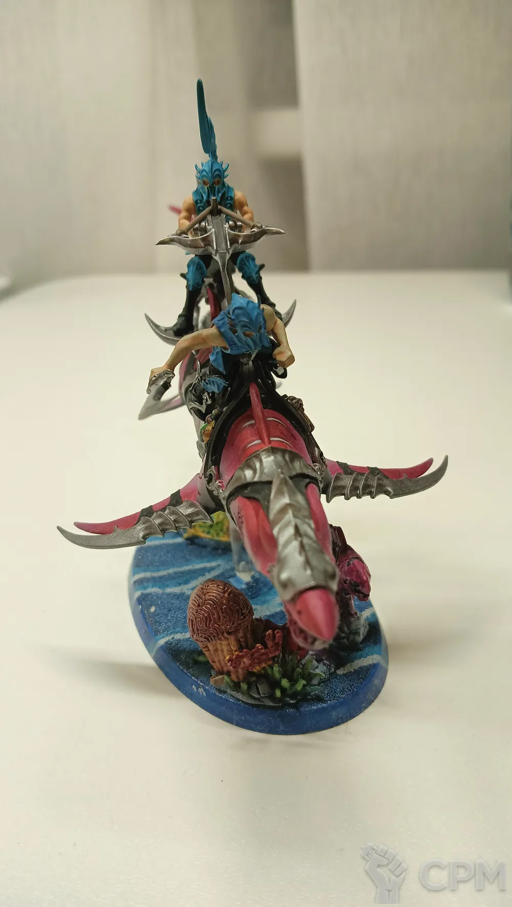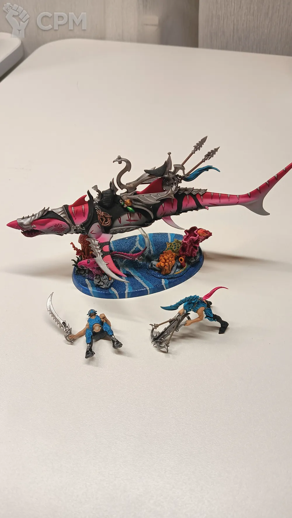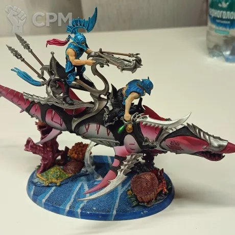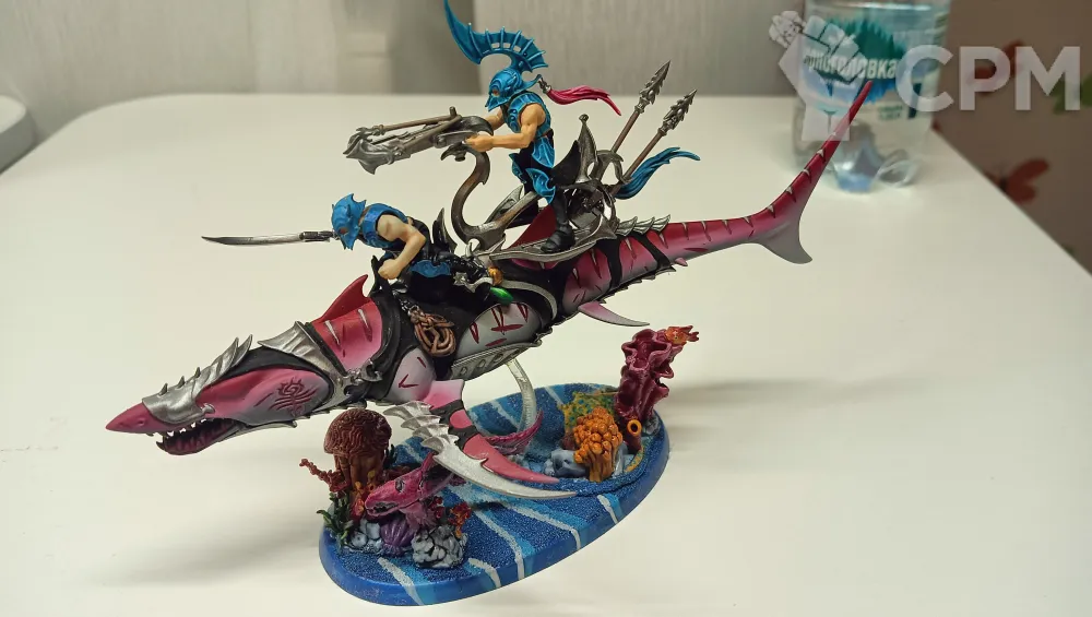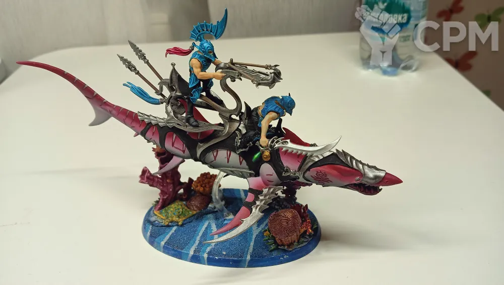 Акула, оригинал, отличный покрас, база украшенная 3д печатными кораллами, фигурки наездников не приклеены для удобства транспортировки.