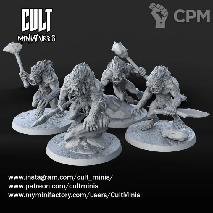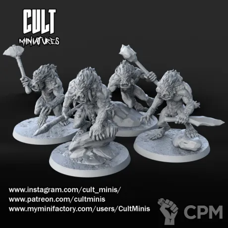Набор из 4 йети с элементами террейна (камни) как на фото, в разобранном виде, без подставок, качественная 3d печать, быстрые сроки.