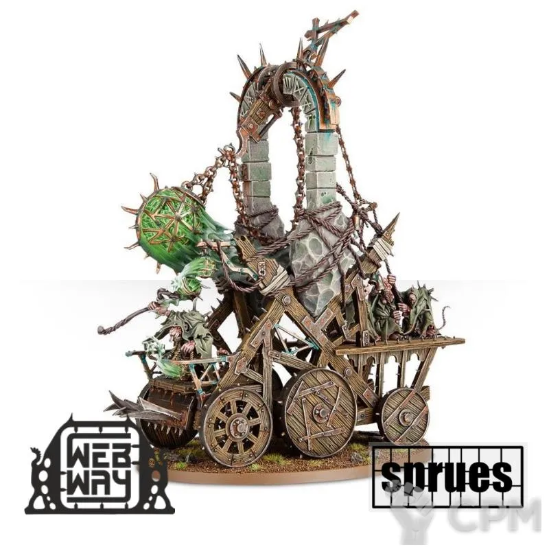 Издавая гудящий звук болезней и гниения, гигантская курильница Чумной печи неумолимо раскачивается взад-вперед. Удушливые облака зловонных миазмов исходят изнутри, окутывая землю мерзким клубящимся туманом, отталкивающим, гнилостным и всепроникающим. Щебечущий Жрец Чумы, который едет в горнило войны, распространяет свои грязные благословения на поруганную паству.