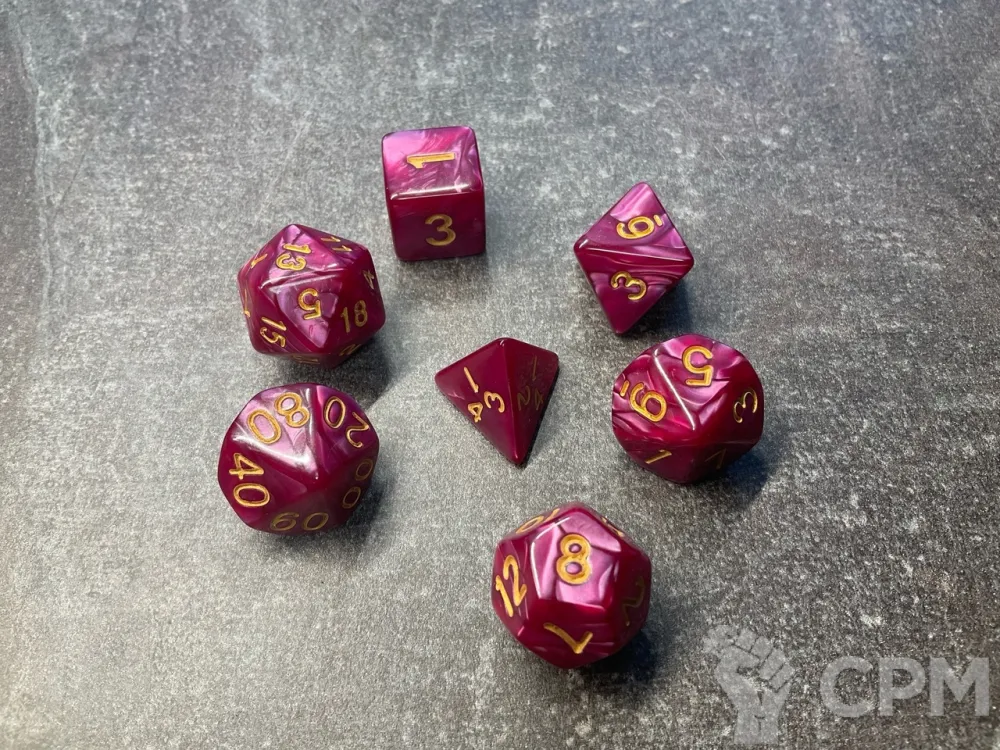 Кубики для ролевых игр с мраморными разводами. 7 кубов: D20, D12, D10, D%, D8, D6, D4.