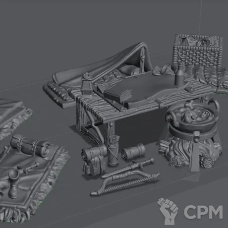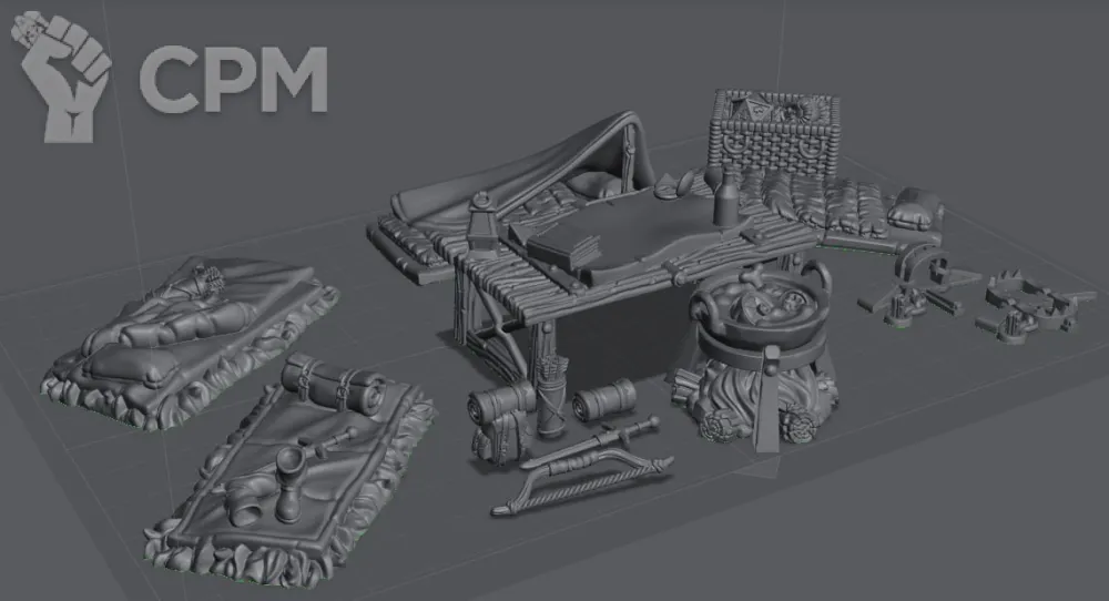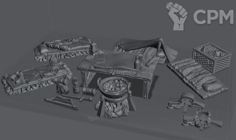 Лагерь приключенцев. Четыре спальника, стол, ящик с ценностями, костер, жаровня, котел. два капкана, снаряжение. Продаётся не собранным. Сделано на 12к принтере с использованием "тугой" смолы(эта смола гораздо прочнее чем стандартная, может гнутся и не ломается)Модели Засвечены. Цвет моделей может отличатся в зависимости от используемой смолы. на качество и детализацию не влияет. Возможен покрас на заказ штатным художником.