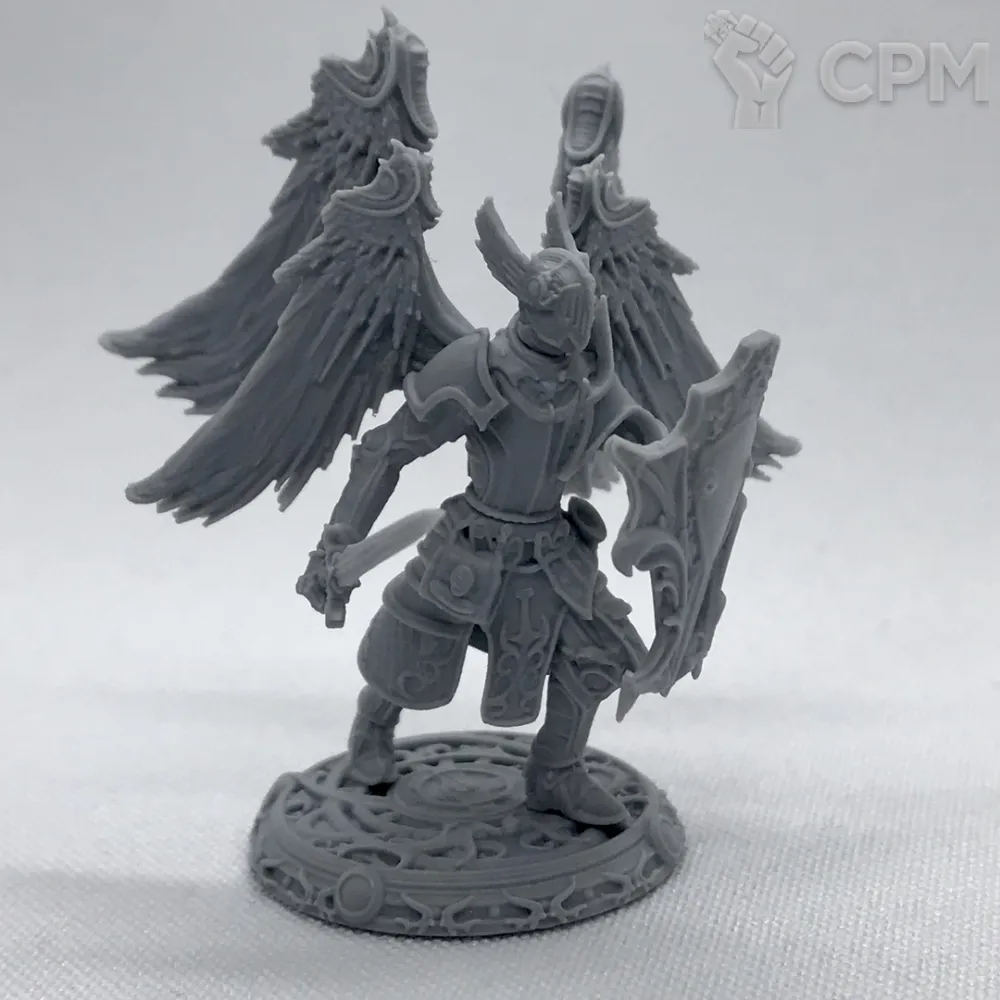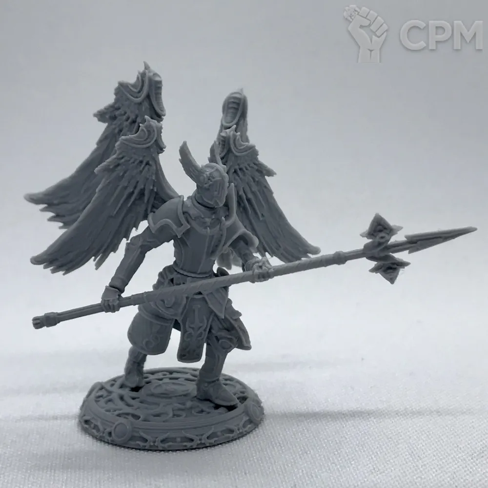 В комплект входят 2 варианта головы (со шлемом и без); 5 вариантов кистей (двуручное копье, молот, два одноручных меча и щит); опции плаща и крыльев на спину; 2 подставки 25мм (фирменная и обычная черная).