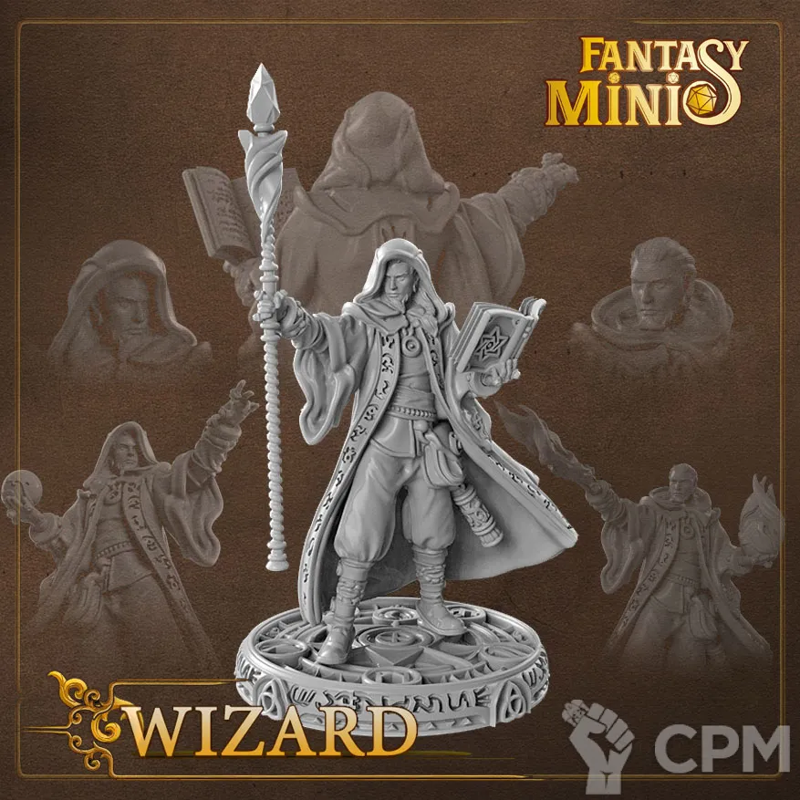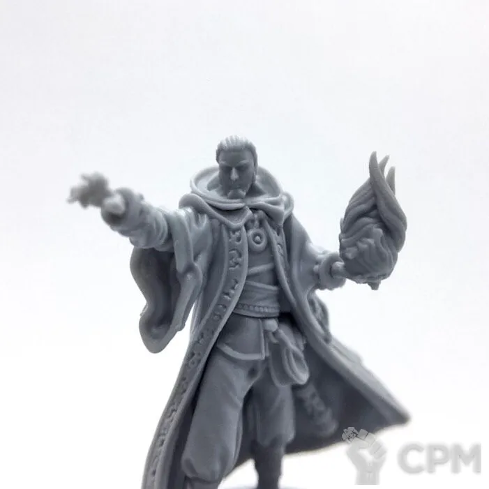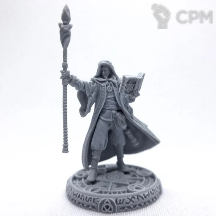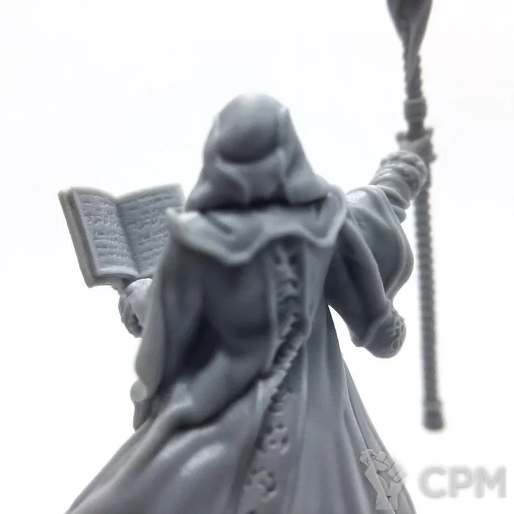 В комплект входят 2 варианта головы (в капюшоне и без); 7 вариантов кистей (посох, стрела огня, гримуар, фаербол, 2 варианта ладони и магический шар); 2 подставки 25мм (фирменная и обычная черная).