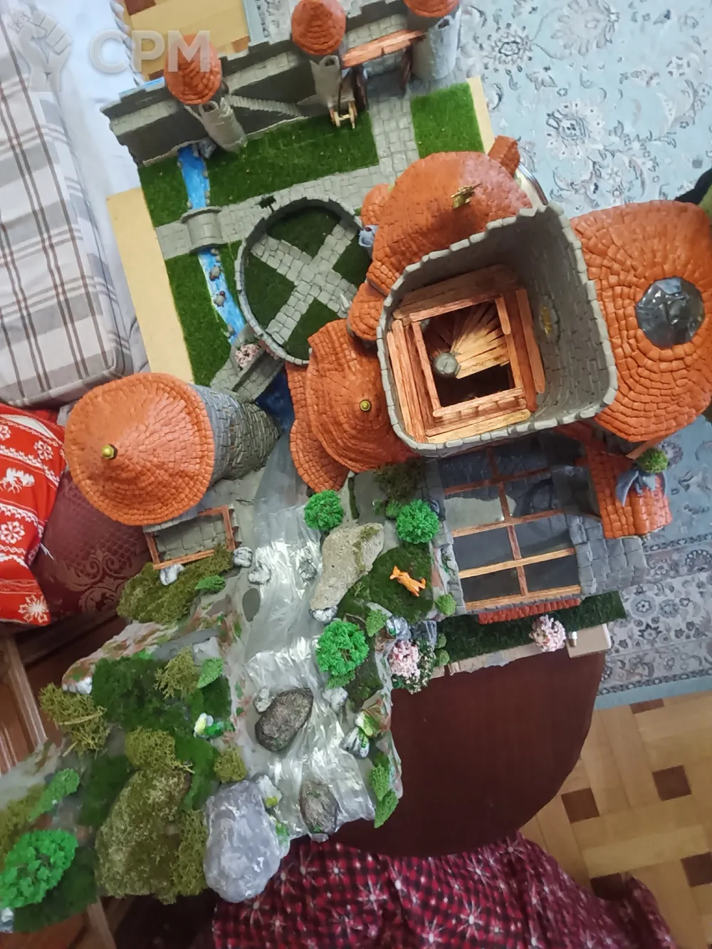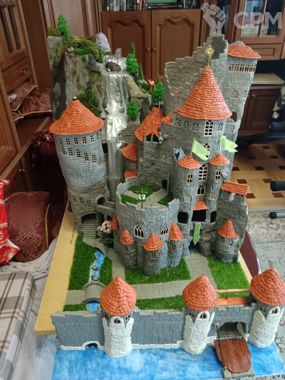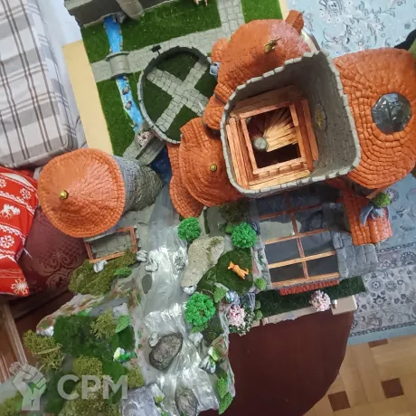 Макет замка "Ниртгар" из романа "Сказание миров". Сделан вручную, преимущественно из скульптурного пластилина, с добавлением элементов макета - флагштоки, деревья, скалы, озеленение, водопад, оконные рамы, светодиодная подсветка. Замок "обрезан" по доной из сторон, что бы было лучше видно внутреннее устройство и переходы. К макету прилагается подробный план на все 9 этажей, также к замку примыкают внутренний двор с частью крепостной стены, главными воротами, подъемным механизмом, башня магов (все тайные комнаты и переходы отделаны со всеми подробностями), скальный массив, внутри которого и располагается часть замка, и водопад.