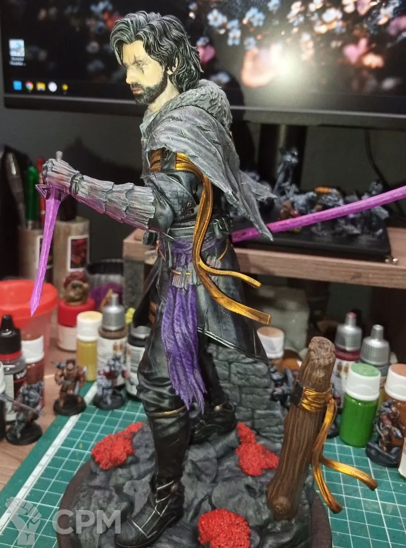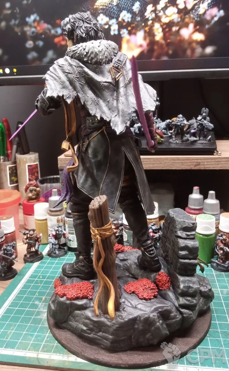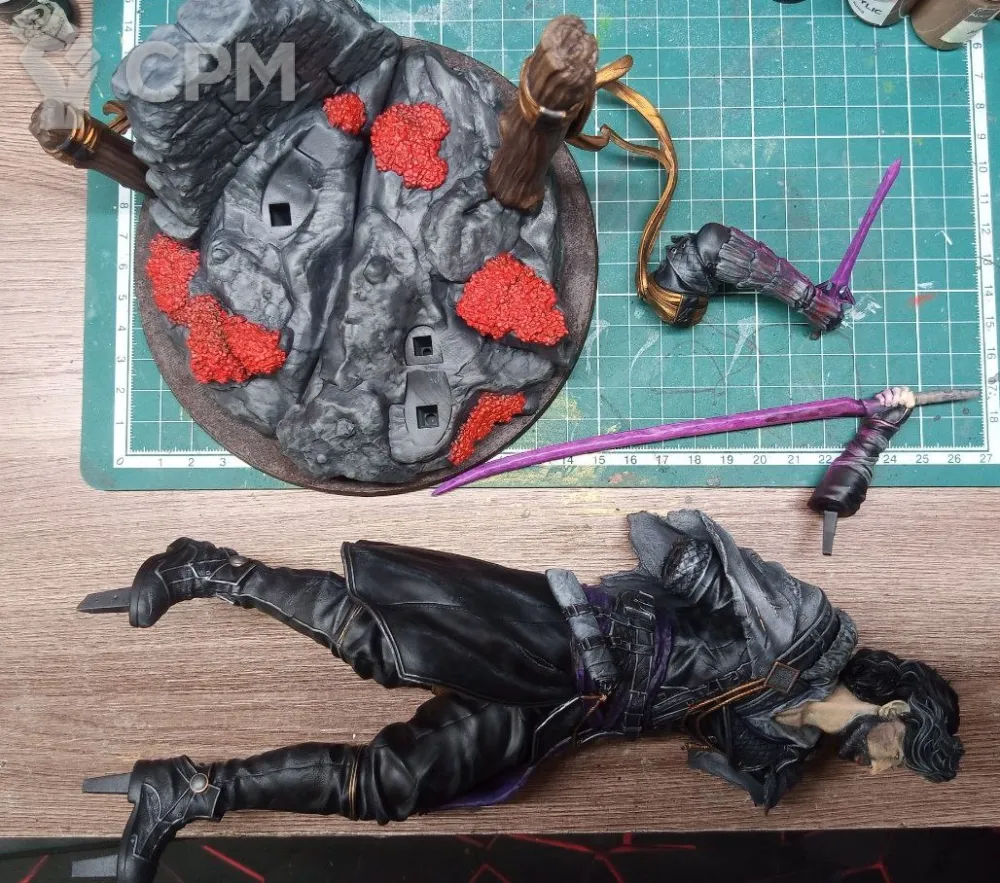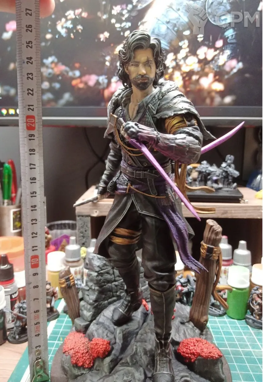 3Д печать, крупные части пустотелые, мелкие полные. Окрашено, покрыто лаком. Склеено не полностью, для того что-бы упаковать для безопасной транспортировки, необходимо будет приклеить руки и тело к подставке.